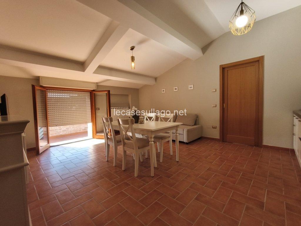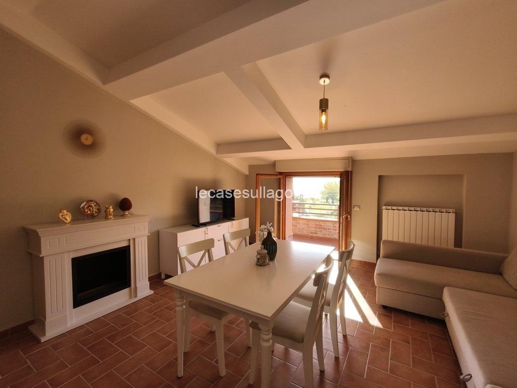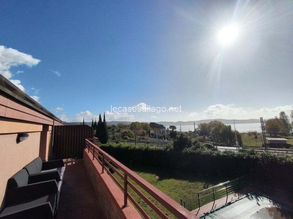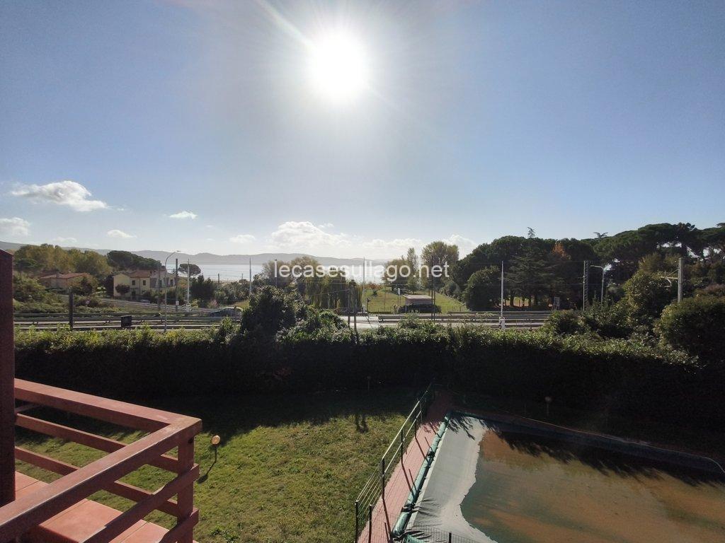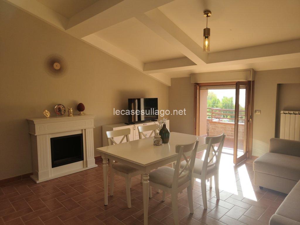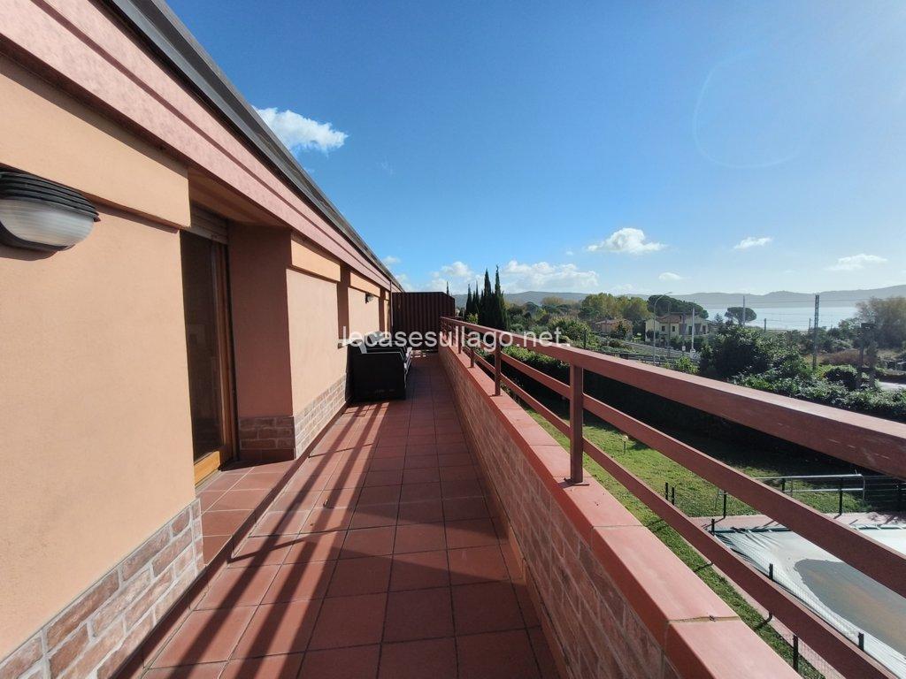 Nelle immediate vicinanze del bel centro storico di Passignano sul Trasimeno, in posizione riservata, molto panoramica e a pochi metri dal lago, proponiamo per la vendita un attico posto al secondo piano con ampia terrazza, ampio giardino condominiale con bellissima piscina recintata e posto auto coperto privato. L’attico, di 80 mq circa, è composto da un luminoso soggiorno con angolo cottura, un disimpegno, due camere matrimoniali ed un bagno con doccia. La terrazza di circa 25 mq che si sviluppa su due lati, può essere raggiunta sia dal soggiorno che dalle camere da letto grazie alle porte finestre, è finemente allestita con poltroncine ed ombrellone, insieme al giardino ben curato e all’ampia piscina condominiale di 12 x 5 ml  sono spazi ideali per vivere momenti all’aperto durante la bella stagione. Completa la proprietà un posto auto coperto esclusivo di circa 13 mq, posto al piano primo sotto-strada ed un ampio porticato comune. Questa deliziosa casa viene venduta completamente arredata, inclusa anche l’attrezzatura del terrazzo e della piscina. Ogni ambiente è caratterizzato da uno stile lineare dai toni delicati che dona armonia e pacatezza, di fatto una particolare attenzione è stata data alla disposizione, scelta del mobilio nonché dei materiali, una ricerca dei dettagli condotta dai proprietari con estremo gusto. Ottime finiture, sono presenti pavimenti in cotto nella zona giorno e parquet nella zona notte, porte in legno massello ed infissi in legno con doppio vetro. Tutte le altre utenze sono regolarmente allacciate alle reti pubbliche. Inoltre, l’appartamento dispone di acqua potabile fornita dal pozzo con impianto di filtraggio, riscaldamento autonomo a metano ed un elegante camino a bioetanolo atossico situato nel soggiorno. Cancello elettrico per accedere al condominio, il giardino è completamente recintato e illuminato.  L’immobile, in perfette condizioni manutentive, è abitabile fin da subito ed è situato in una palazzina edificata nel 1990, il cui il secondo piano è stato interamente costruito nel 2006. I costi condominiali ammontano a circa 69 € al mese e comprendono l’illuminazione esterna, la pulizia generale, la manutenzione delle aree verdi, della piscina e il consumo dell’acqua uso privato dell’appartamento. Il condominio è perfettamente mantenuto e ottimamente gestito. L’immobile volge a Sud – Ovest, con il lago e la pista ciclabile raggiungibile a piedi. Situato in un contesto gradevole e molto quieto, con comodo parcheggio libero e a pochi passi dai servizi locali dove è possibile trovare tutto ciò di cui si ha bisogno.