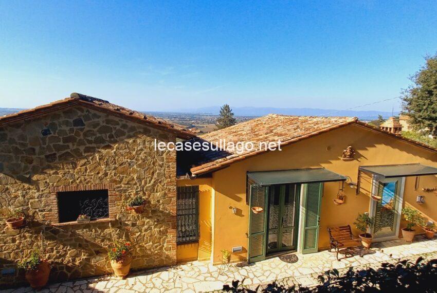 Il casale “Il Dipinto” si trova ad 1 km dal caratteristico borgo di Panicale e appena si arriva alla proprietà si denota subito un estremo gusto e una particolare cura dei dettagli. Al piano terra del casale si può accedere da due entrate diverse. Entrando dall’ingresso principale, troviamo un disimpegno, proseguendo a destra si accede ad un ampio soggiorno con camino, una porta finestra che accede direttamente al giardino ed una cucina attrezzata. Proseguendo nell’altro lato del soggiorno, troviamo una dispensa, un bagno con doccia, una camera matrimoniale con delizioso soppalco e dotata di una cabina armadio. Al piano inferiore, la prima stanza che troviamo è occupata da un accogliente soggiorno, con una predisposizione per un angolo cottura, con una parte dedicata a studio, e attiguo un bagno. Proseguendo, si accede in una camera matrimoniale con annesso un antibagno e il bagno con la vasca. La camera matrimoniale ha un’uscita propria nel patio. I due livelli sono dotati di un proprio ingresso indipendente e collegati tra loro tramite due scale esterne, una rivolta a Sud con adiacente un lastrico solare con vista mozzafiato ed una rivolta ad Ovest che conduce al bellissimo e spazioso patio. Attiguo al soggiorno del piano terra troviamo un altro bello spazio accuratamente attrezzato. Tutte le aree esterne sono ideali per vivere momenti all’aperto. Vicino al casale si trova un annesso di 18 mq, di nuova costruzione, utilizzato come rimessa attrezzi, lavanderia e centrale termica. Il terreno circostante la proprietà misura 2300 mq circa, è completamente recintato e con doppio ingresso di cui uno con cancello automatico, è illuminato e dotato di impianto di irrigazione programmabile. E’ destinato ad un giardino estremamente curato, con una verde zona relax abbellita con piante ornamentali, piante da frutto e include anche un uliveto costituito da 50 piante in piena produzione. E’ possibile realizzare una piscina. Il casale misura circa 150 mq, vanta di una ristrutturazione recente, condotta dal proprietario con estremo gusto nella scelta stilistica. Lo stato di manutenzione è ottimo. Le facciate sono nella maggior parte in pietra faccia vista, in una parte della casa risalta un bel dipinto raffigurante il Palazzo del Podestà realizzato da una pittrice del luogo. Gli infissi in legno, di un delicato color salvia, hanno le zanzariere, il tetto è isolato e coibentato. Internamente parte dei muri sono in pietra faccia vista, i pavimenti in cotto, i solai con travature di castagno e tavelle tipiche in cotto, le porte in legno massello, i radiatori in ghisa. Nel casale sono presenti tutte le utenze, e regolarmente allacciate alle reti nazionali o comunali quali acquedotto, energia elettrica, telefonia con rete internet, antenna satellitare. Il riscaldamento è garantito da una caldaia a condensazione funzionante a gpl e dal camino ventilato. Possibilità di acquistare l’arredamento e ulteriore terreno. La proprietà può essere utilizzata come prima casa, o come seconda casa, con la possibilità di ospitare grazie alla sua divisione interna. Ubicata in campagna in posizione collinare e non troppo isolata, la proprietà gode di notevole privacy. La strada di accesso è bianca per l’ultimo tratto, ed agevole in ogni periodo dell’anno. L’immobile si trova in un contesto di vincolo paesaggistico, la location è estremamente panoramica, con vista sul Lago Trasimeno, sulle campagne umbre e sulla vicina Toscana. Dalla proprietà si possono godere dei suggestivi tramonti poiché il casale volge ad Ovest. Si trova a circa 1 km dal caratteristico borgo di Panicale e a 4 km da Paciano. Nelle vicinanze si possono visitare i borghi che circondano il Lago Trasimeno e Città della Pieve. A 30 km troviamo Perugia e il suo aeroporto, la superstrada Orte – Ravenna, a 17 km la Città di Chiusi con la stazione ferroviaria sulla direttrice Milano-Roma-Napoli e con l’autostrada A1 Milano-Roma-Napoli.