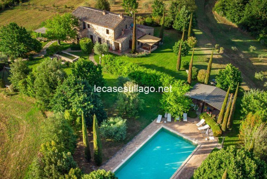 Ai piedi del borgo storico di Città della Pieve, nella campagna umbra al confine con la Toscana, un affascinante casale in pietra, risalente alla metà del 700, di circa 340 mq finemente ristrutturato nel 2003 in ogni dettaglio. Il casale si sviluppa su due livelli, al piano terra formato da: ampio soggiorno con camino e cucina, tre camere da letto, tre bagni. Al piano primo con accesso tramite scala esterna, ampio soggiorno con camino e cucina, tre camere da letto, tre bagni. Il casale è circondato da una meravigliosa corte con prato all’inglese e una grande varietà di piante caratteristiche della campagna circostante. Nell’area esterna spicca la grande piscina riscaldata di 14×7 metri e anche una cucina esterna e una vasca per pesci popolata da carpe Koi. La proprietà si completa con circa 1,3 ha di terreno agricolo. Il casale, attualmente adibito ad attività ricettiva ben avviata, oltre ad essere il luogo ideale per una classica casa di campagna privata, rappresenta un ottimo investimento per chi intende proporlo per brevi affitti a turisti, soprattutto stranieri, molto attratti dal territorio per le sue caratteristiche naturali, culturali ed enogastronomiche. I due piani sono completamente indipendenti, uniti da una scala esterna, che permette l’utilizzo dell’immobile come se fossero due appartamenti separati preservando la massima privacy. L’immobile si trova a pochi minuti dal centro storico di Città della Pieve (PG) che è nota per le sue bellezze medievali e per la sua campagna, affacciata sulla Valdichiana, che da sempre attira visitatori da tutto il mondo oltre che personaggi famosi di ogni genere, che hanno scelto la loro seconda casa di campagna in questi luoghi. La zona è facilmente raggiungibile sia in auto, l’uscita di Fabro dell’autostrada A1 dista solo 15 minuti, sia in treno passando per la stazione di Chiusi – Chianciano Terme.